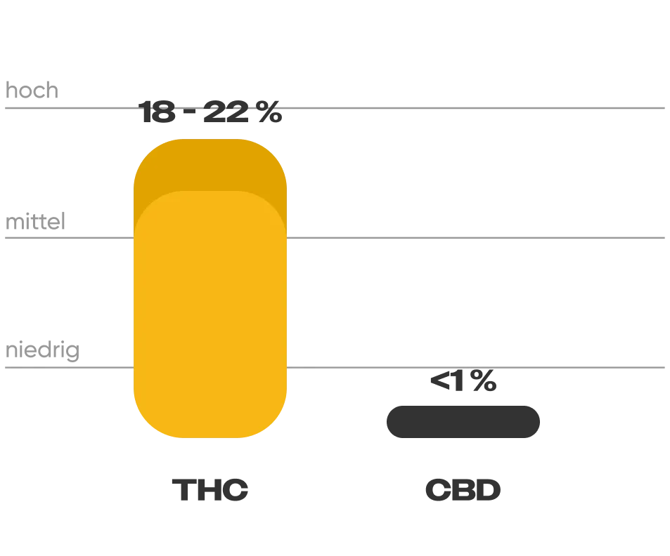 Blue Cheese hat einen hohen THC-Gehalt zwischen 18 und 22 %. Der CBD-Gehalt beträgt weniger als 1 %.