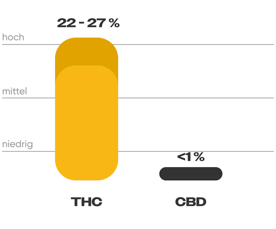 Dark Shadow Haze hat einen hohen THC-Gehalt zwischen 22 und 27 %. Der CBD-Gehalt beträgt weniger als 1 %..
