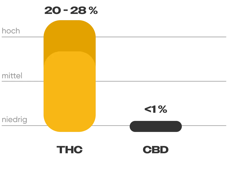 Lemon Cherry Gelato hat einen hohen THC-Gehalt zwischen 20 und 28 %. Der CBD-Gehalt liegt bei weniger als 1 %.