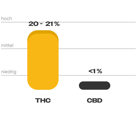 Melonade hat einen hohen THC-Gehalt zwischen 20 und 21 %. Der CBD-Gehalt beträgt weniger als 1 %.