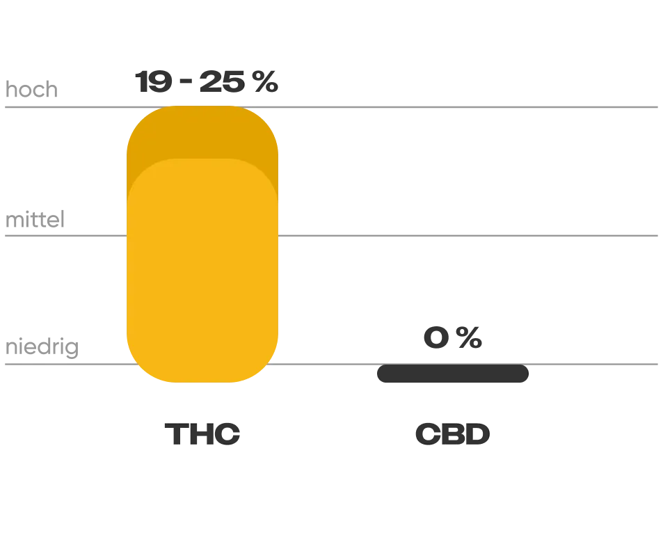 OG Kush hat einen hohen THC-Gehalt von 19 bis 25 %. Der CBD-Gehalt beträgt etwa 0 %.
