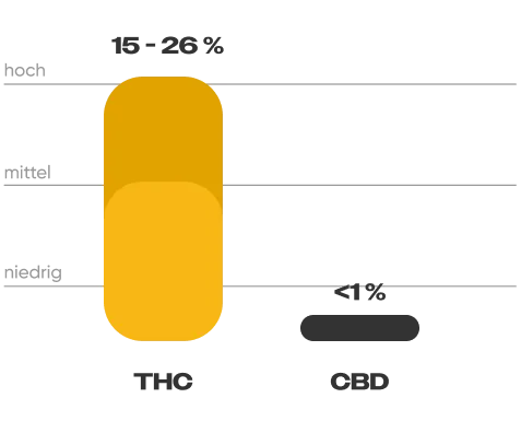 Pink Kush hat einen THC-Gehalt, der zwischen 15 und 26 % variieren kann. Der CBD-Gehalt beträgt weniger als 1 %.
