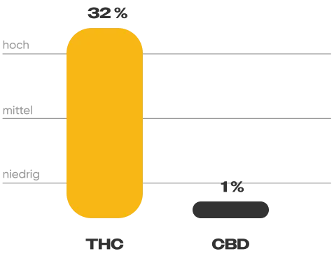 Spritzer hat einen hohen THC-Gehalt von rund 32 %. Der CBD-Gehalt beträgt etwa 1 %.