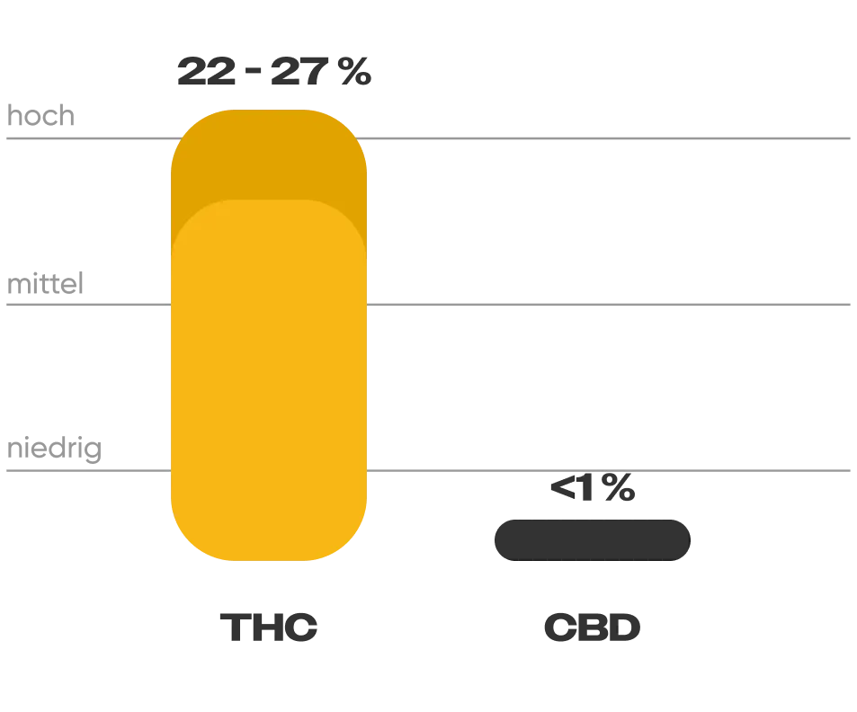 Strawberry Diesel hat einen hohen THC-Gehalt zwischen 22 und 27 %. Der CBD-Gehalt liegt bei weniger als 1 %.